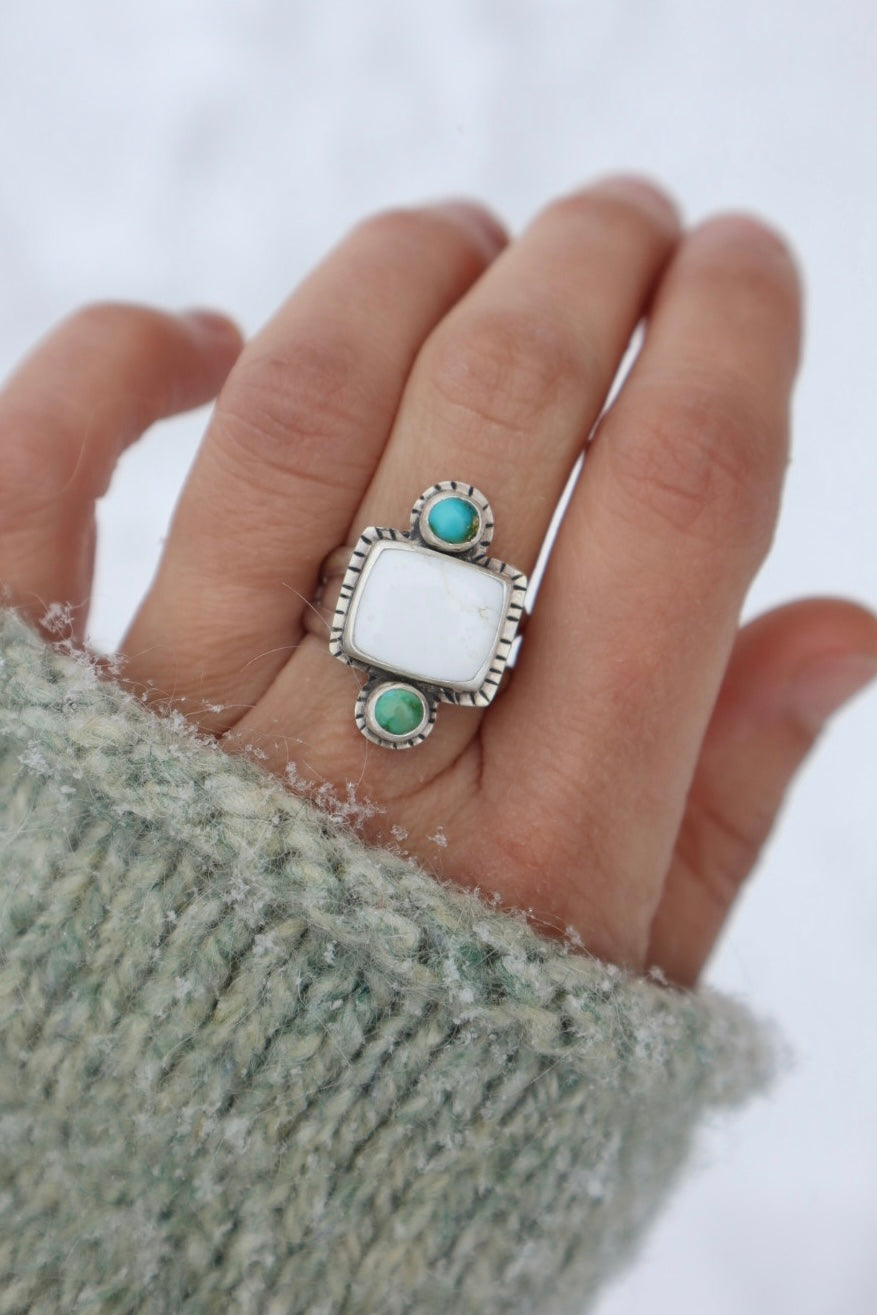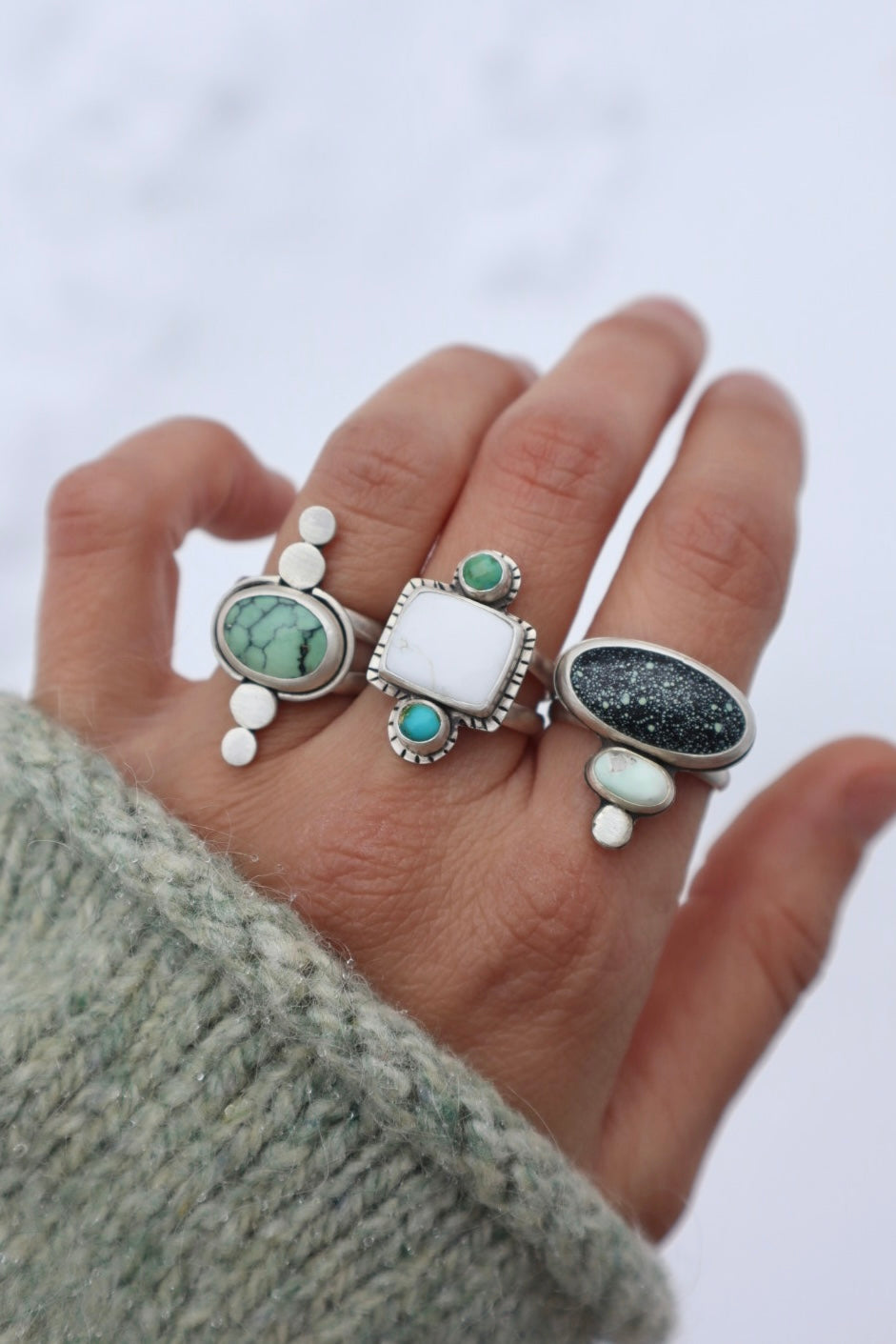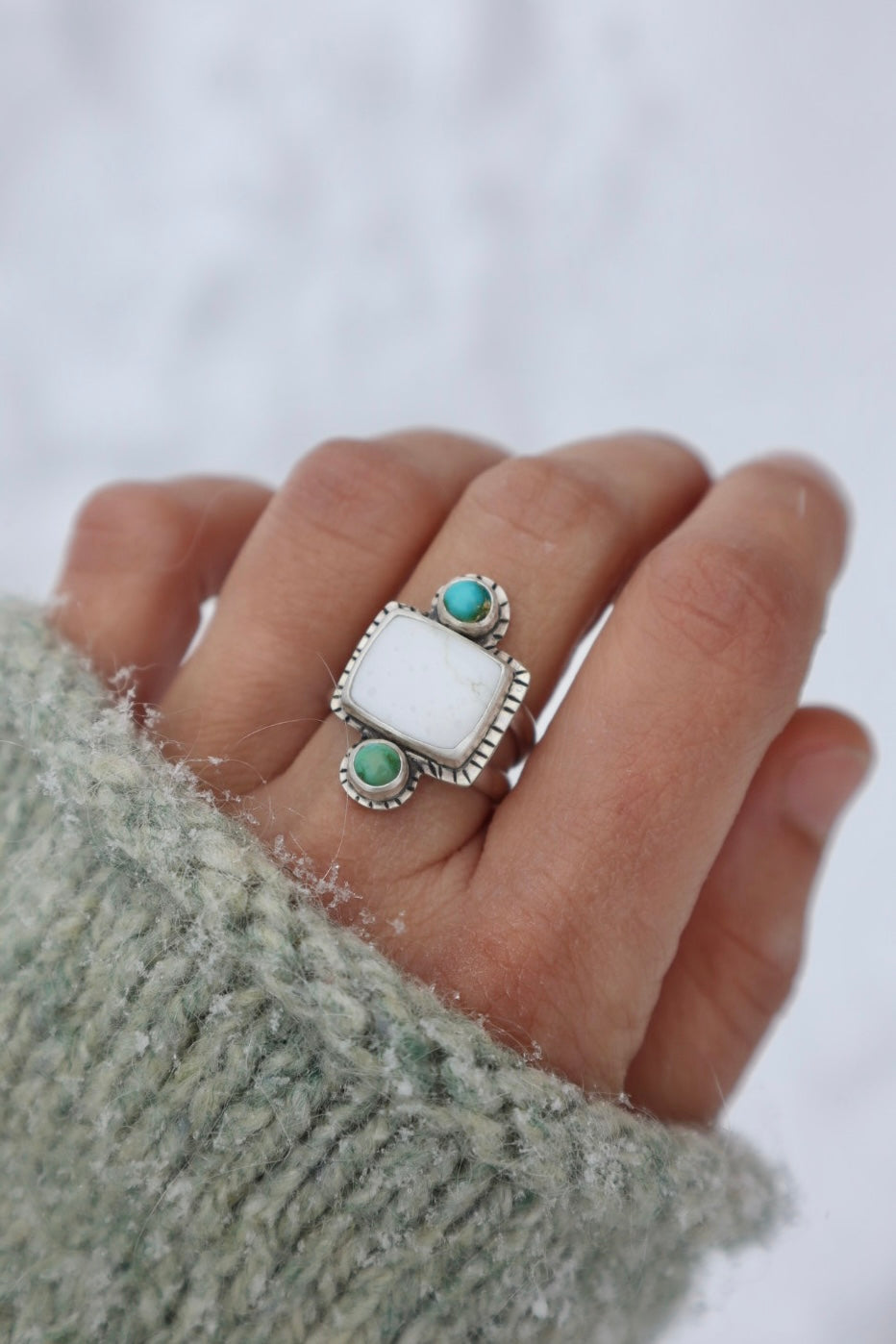 I love this combination of rich white with the pops of blues and greens. It’s fun and playful and almost like an invitation to listen and follow that inner calling. The band is a split shank so it’s comfortable on the finger all day, everyday.