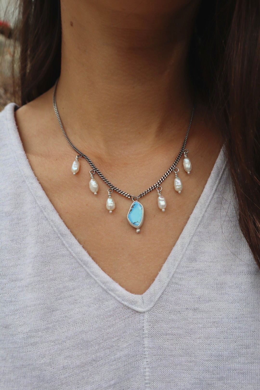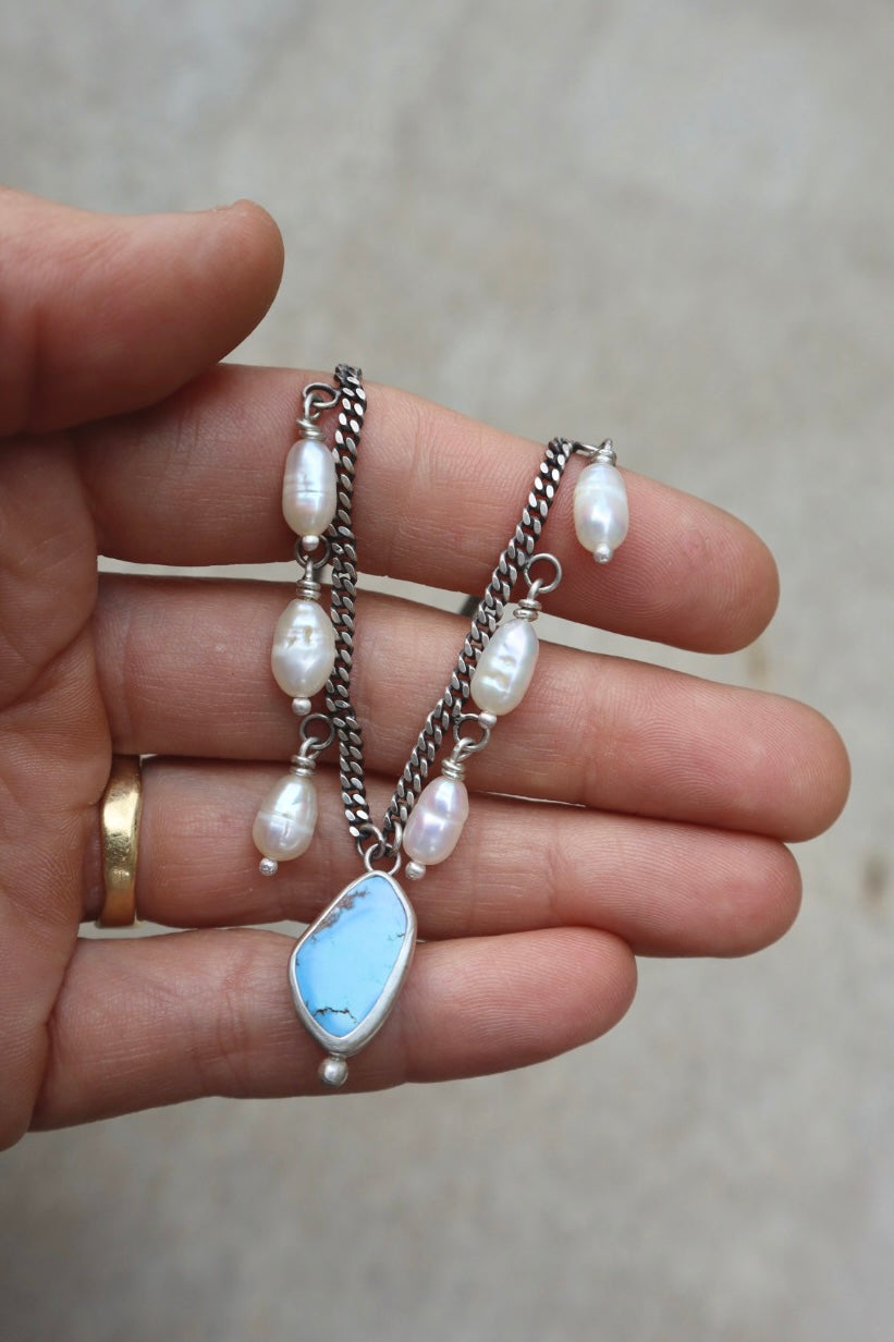 This piece came out of a desire to pair Lavender turquoise with pearls in a simple, playful way. The pearls have the freedom to swing and sway along a chain adding beautiful movement and dynamic to the piece.