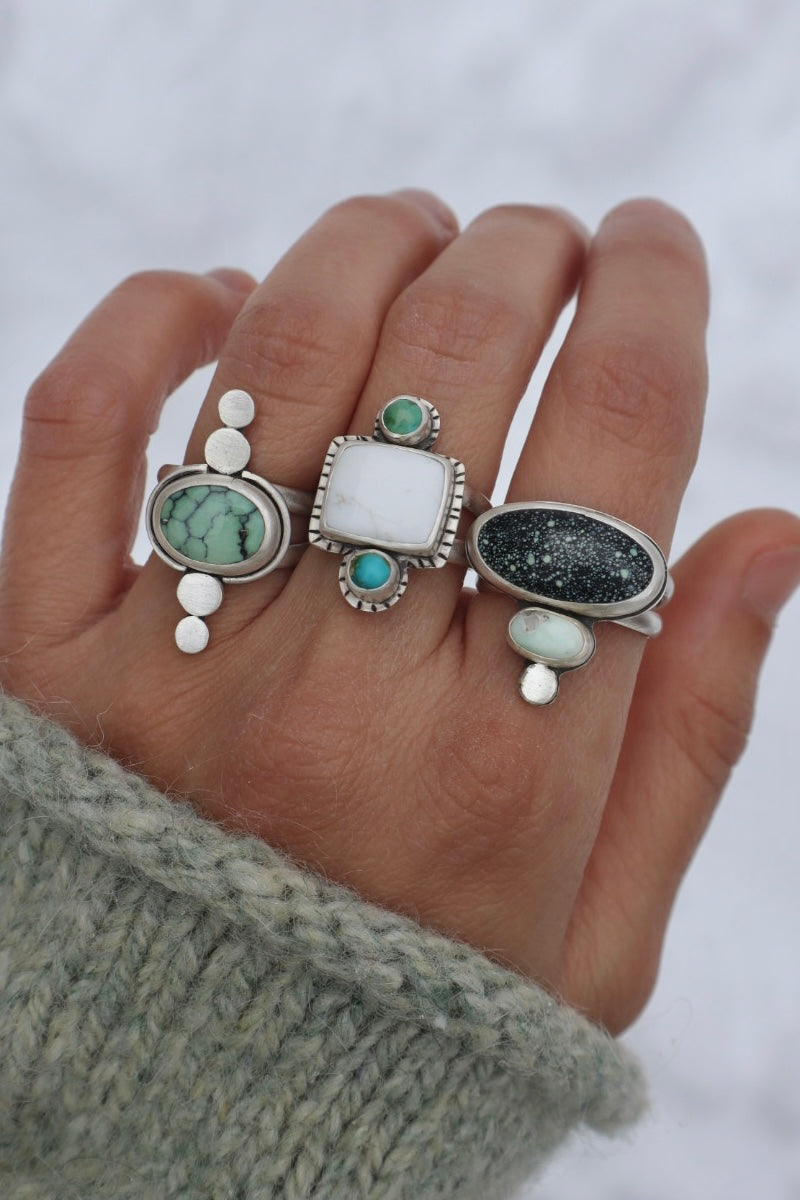When I was shopping at the Tucson Gem show this year, I can across a beautiful offering of New Lander Variscite and instantly fell in love with their speckled patterns and different colors. This piece is particular reminds me of a starry night. I’ve highlighted the light greens with a pop of Palomino. It sits in a split shank band.