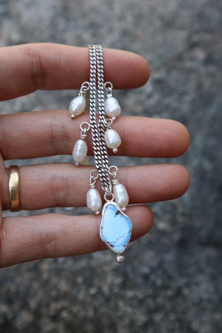 This piece came out of a desire to pair Lavender turquoise with pearls in a simple, playful way. The pearls have the freedom to swing and sway along a chain adding beautiful movement and dynamic to the piece.
