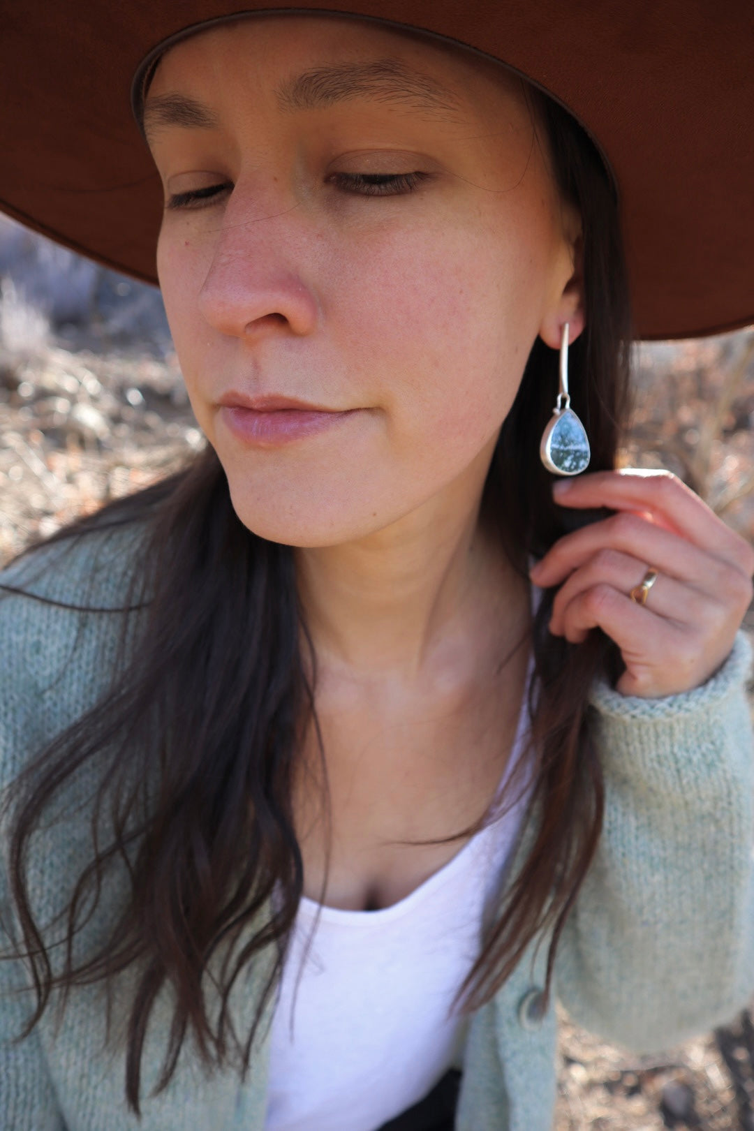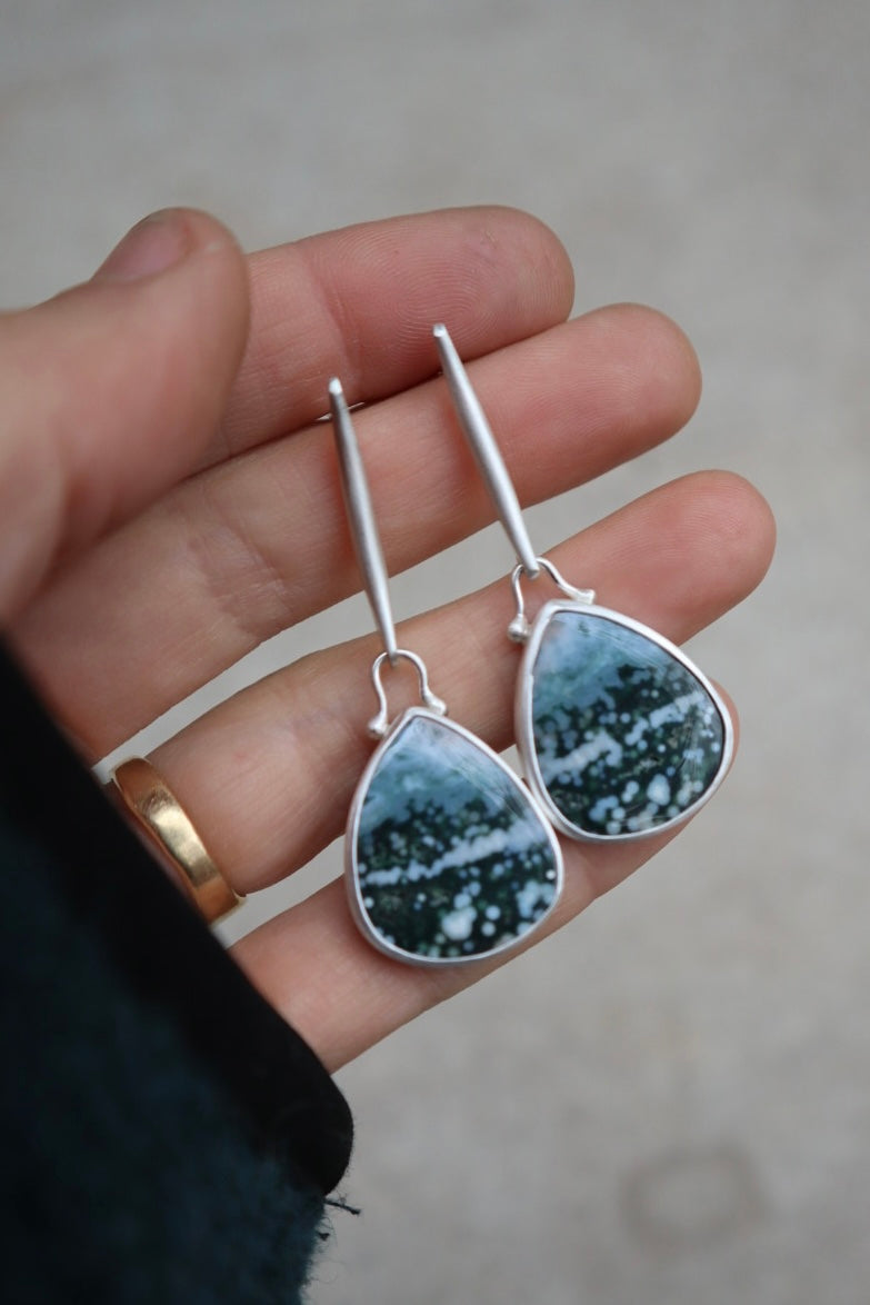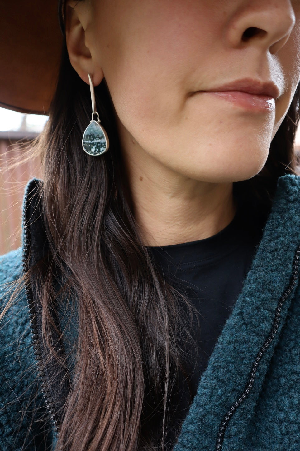 This pair of Ocean Jasper has be one of most beautiful pairs I've seen. The little "bubbles" remind me of a light flurry of snow blessing the sky and land with it's magic and moisture. We could use a little more of that magic here in SW Colorado this year! I've set the stones on a bar that ends in post-backs. They are actually extremely comfortable on the ears because of the way the weight in distributed.