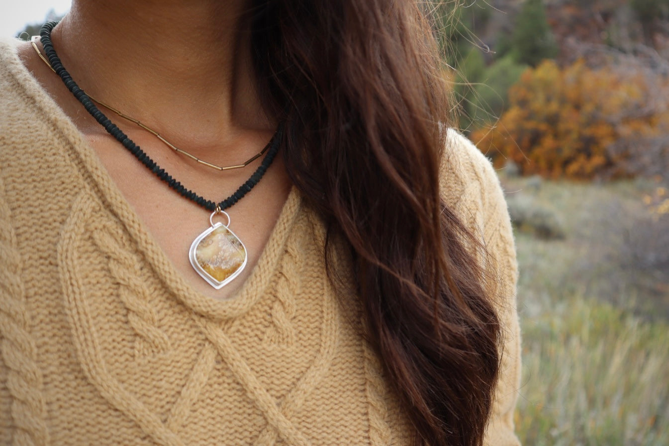 This stone is such a beauty! It embodies this season so perfectly as the leaves change color and fall to the Earth. I’ve strung it on a strand green serpentine with a shorter strand of brass beads that rests above it. The brass brings out the warmth in the stone.