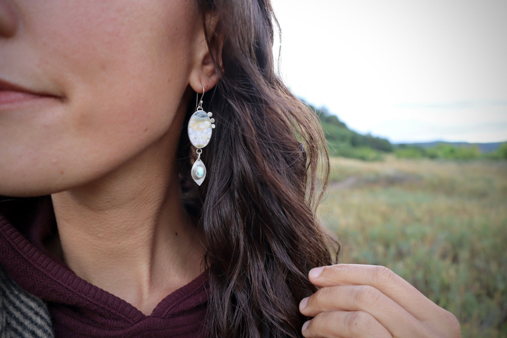 Ocean Jasper is such a special stone. They often have playful circles in them, and this particular pair is soft and abstract, reminding me autumn winds ruffling through flowers or leaves. I’ve cut out the backs of them so you can see the stones from the front and back. Below dangle a small cut of Palamino.