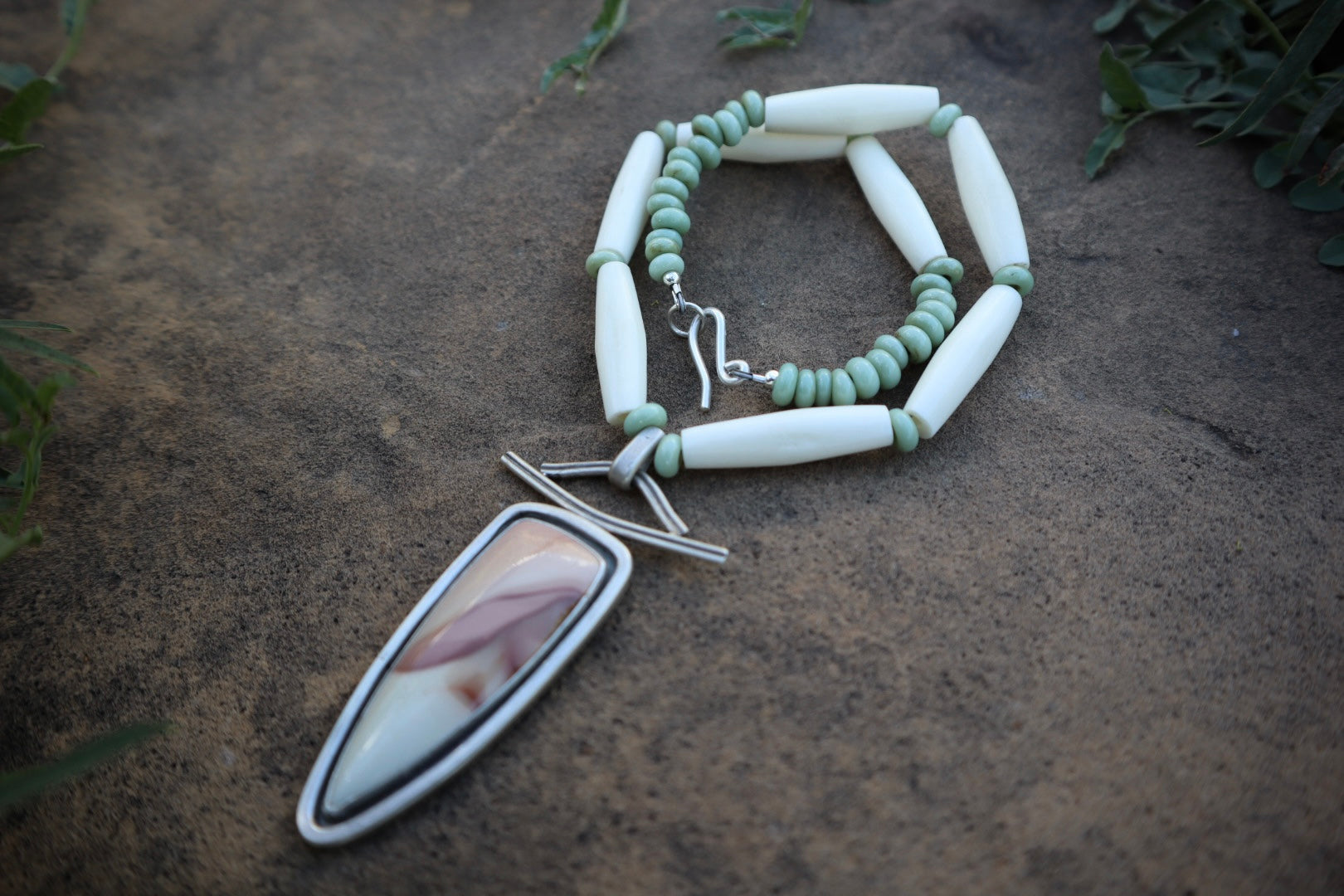 For a few years now I’ve become enamored with the subtly of Willow Creek. It has such soft colors and lines that I experience as very expressive in their subtly. While the stone is already really special, what makes this piece extra special is the beaded necklace it hangs from. I’ve used Kenyan beads made from bone and recycled glass beads from Java that hold a similar energy to the stone. It’s a bold piece, maybe my boldest yet, but I’m a big fan of how it turned out and how it feels around the neck. Truly one of a kind.