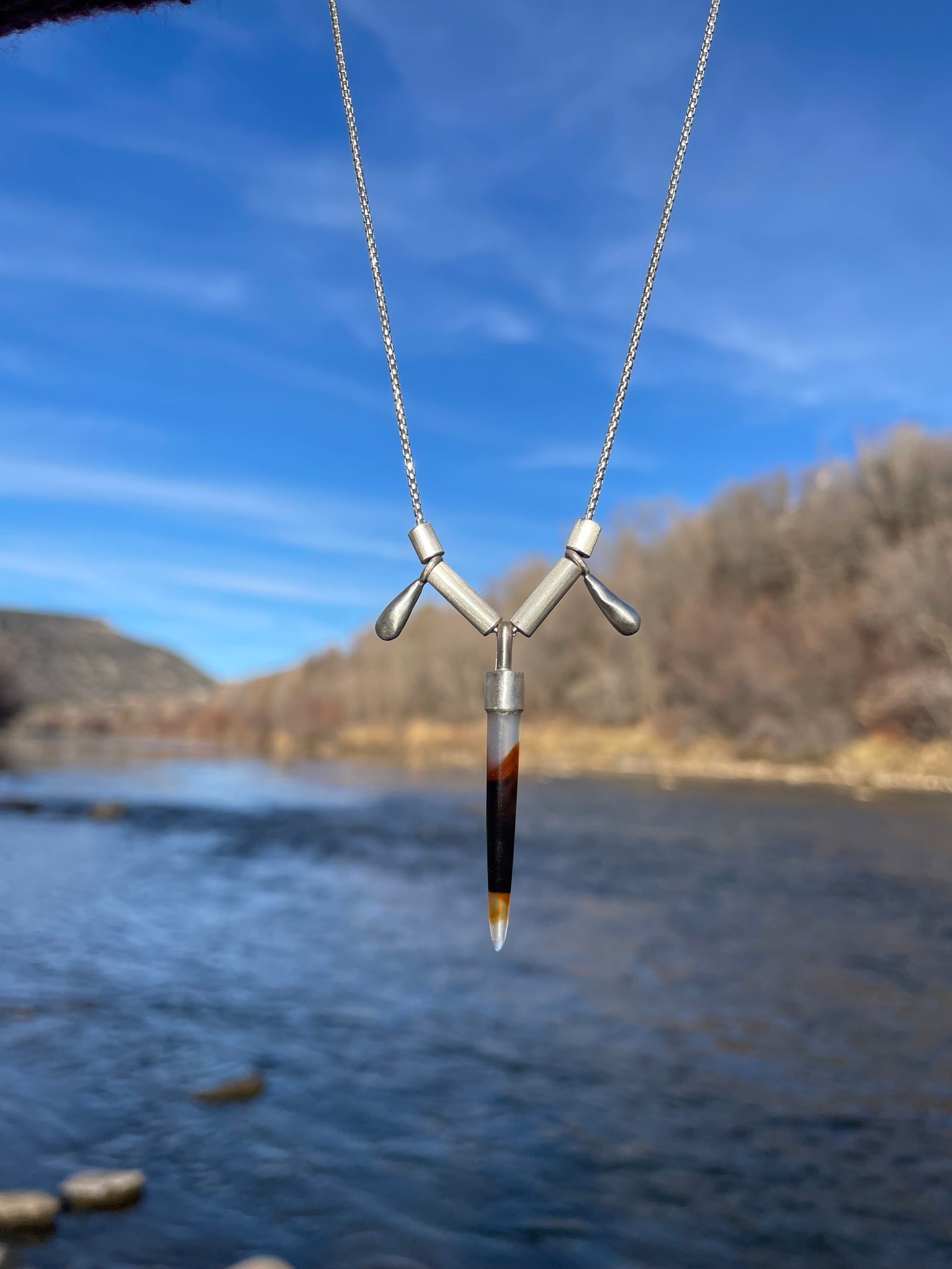 These Montana Agate spikes are just so much fun to play with! They love to dance in the light and are constantly changing their colors. I melted some scrap metal into the drops that hang on either side.