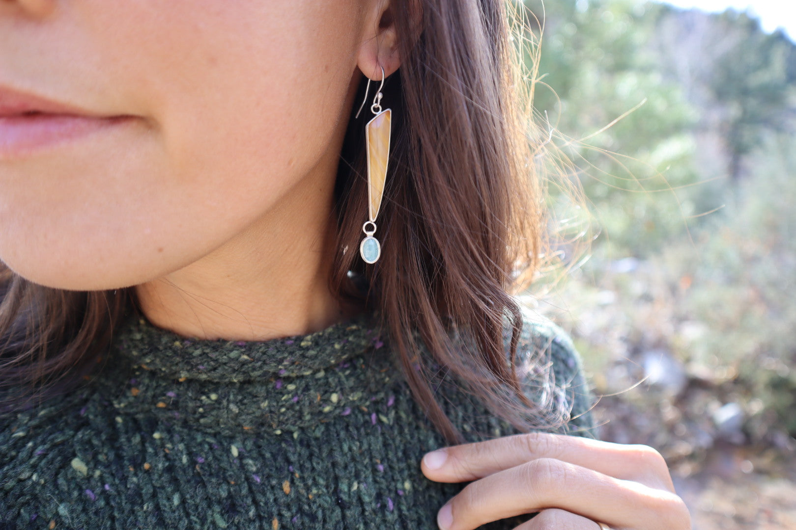 This is such a light-filled pair. The warmth of the Timor agate brings out the brightness of the aquamarine, complimenting each other perfectly. This pair loves to play in the light!