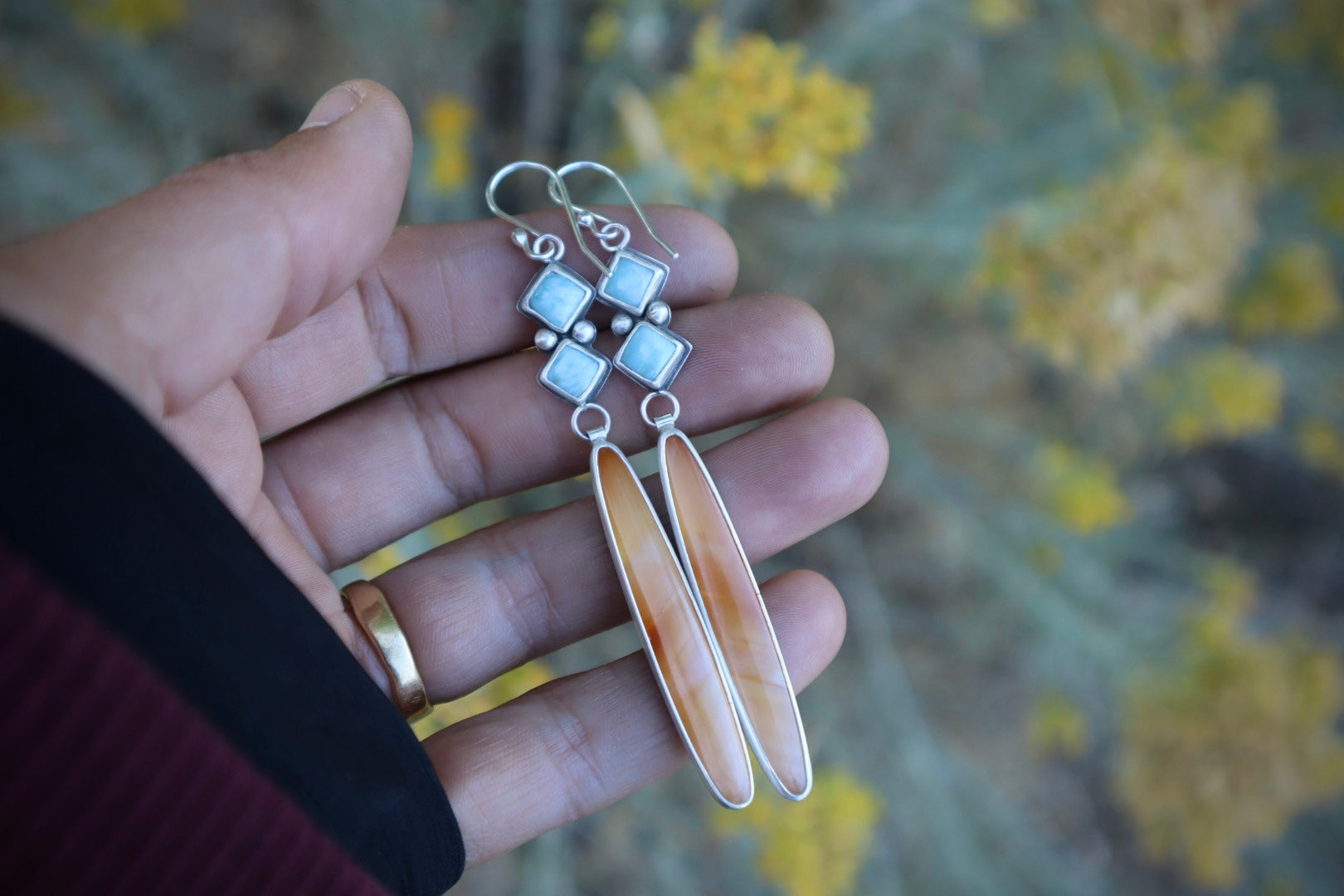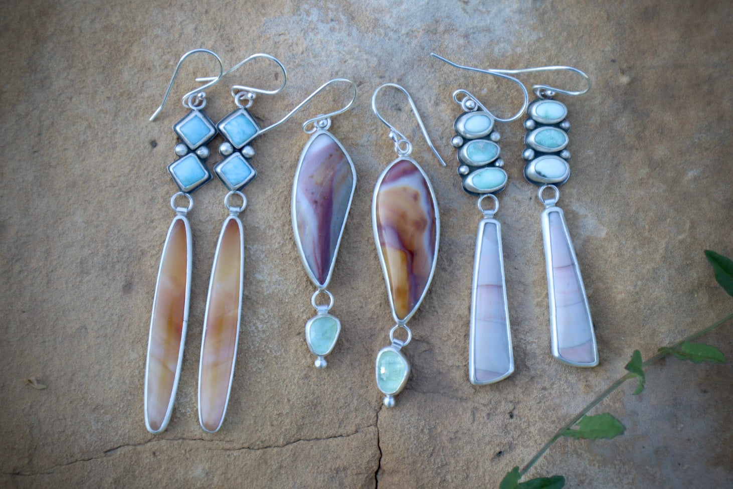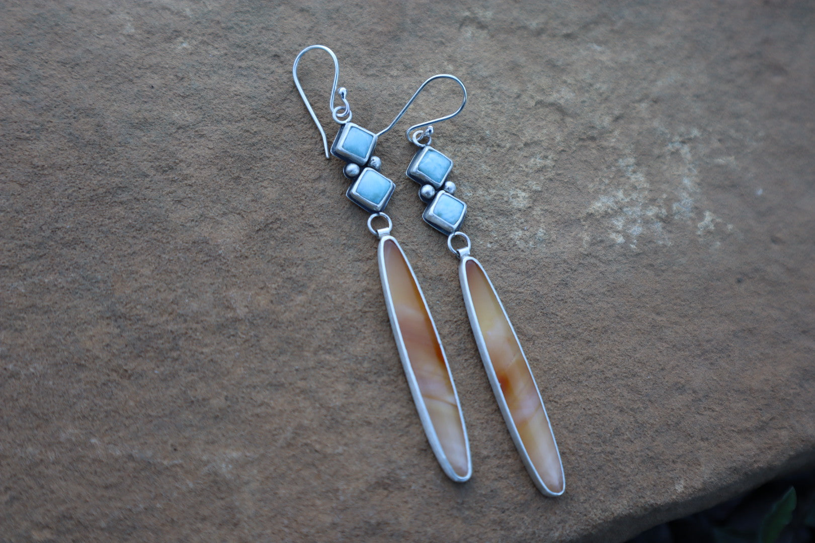 As the leaves of our great Box Elder trees begin to change colors, they get closer and closer to this orange hue of Timor Agate. Above them, the blue, blue skies remain vast and remarkable. The larimar nicely captures that blue. I love how the shapes of these stones come together to compliment each other.