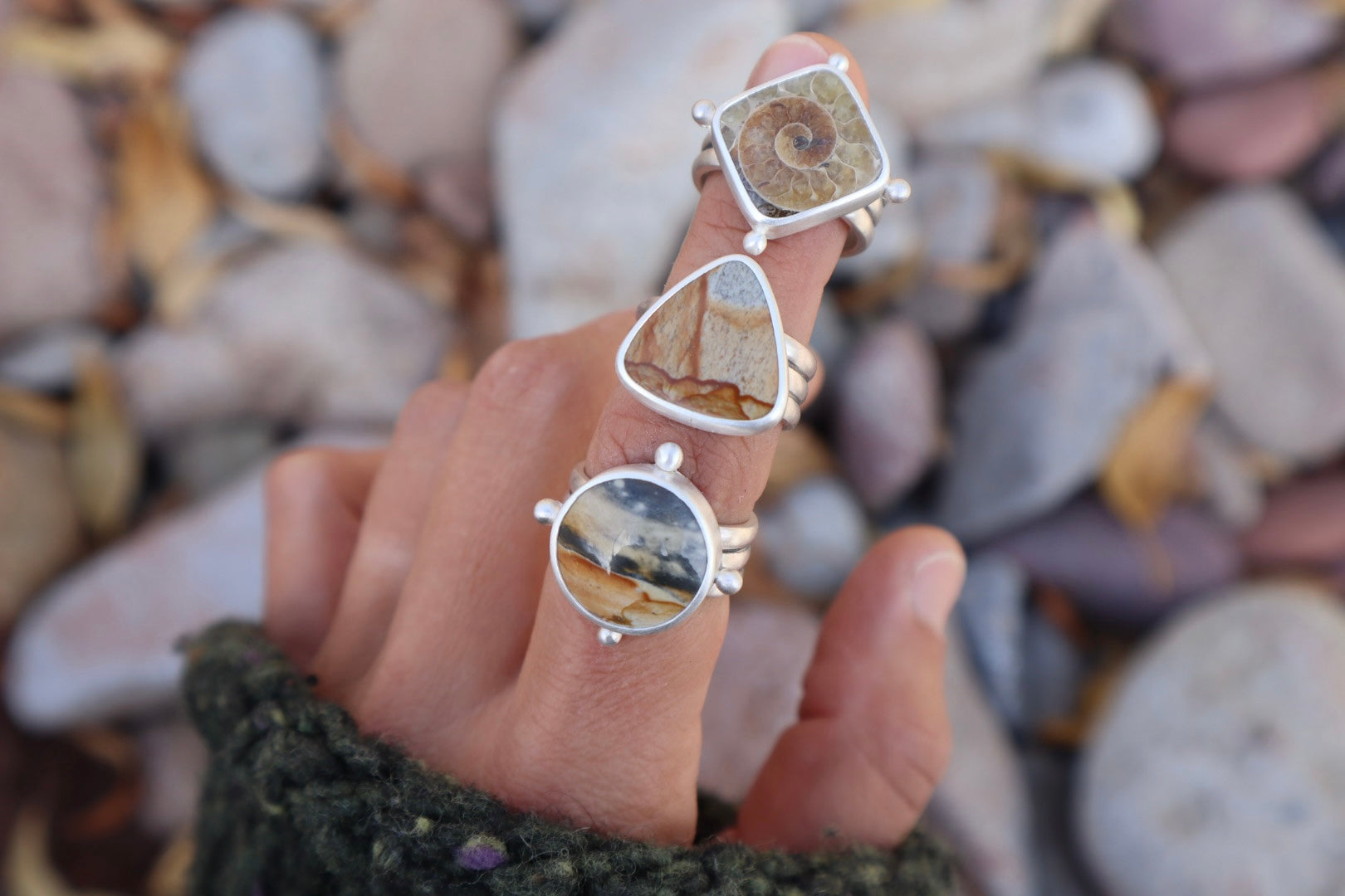 This stone so perfectly captures the majesty of abrupt canyon walls encountered in the desert. Those are the places that I feel deep humility and awe. I've set this stone on a sturdy multi-wire band that is super comfortable on the finger.