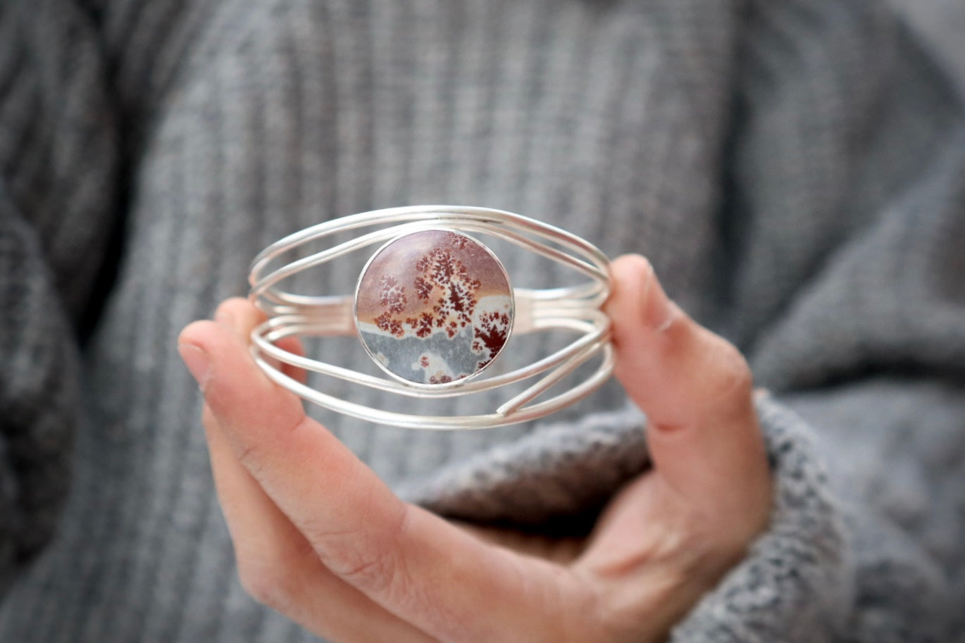 The other morning I got up early and took a walk with the full moon still high in the sky. By the end of my walk an epic sunrise was happening with colors shining around the moon. It was an incredible sight. This stone really feels like it captured that magical moment. One of surprise and wonder and awe. I hope this cuff embodies that feeling for you too.