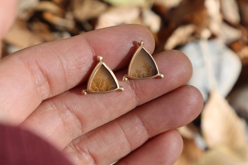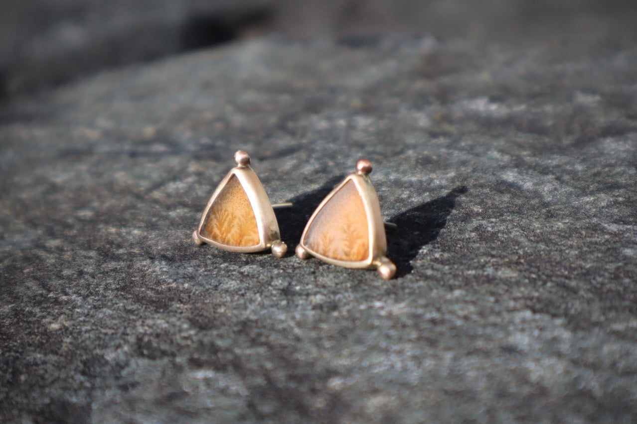 These stones were begging to be wrapped in gold. Together the colors are pure bliss. I've used 14k gold for the bezel and embellishments while the backplate and posts are sterling silver