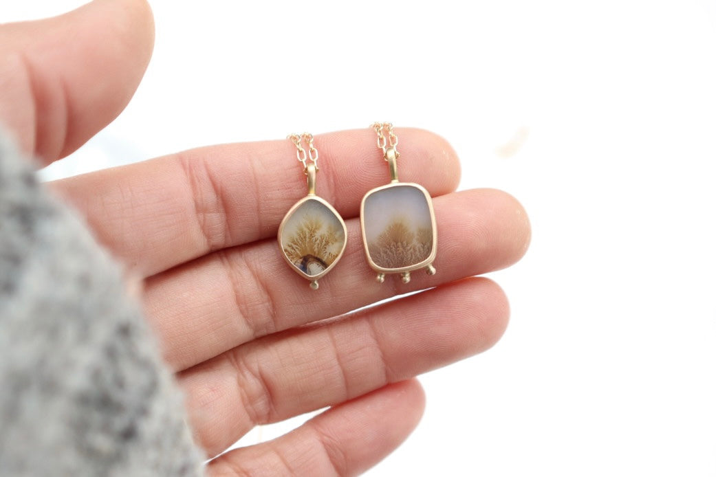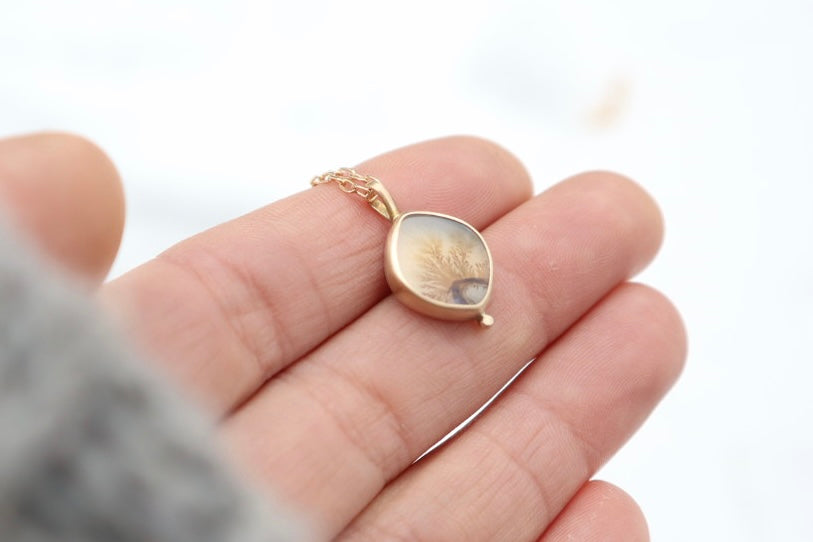 This stone was begging to be wrapped in gold. Together the colors are pure bliss. I've used 14k gold for the bezel, bail and embellishments while the backplate is sterling silver. The chain is 14k gold-fill.