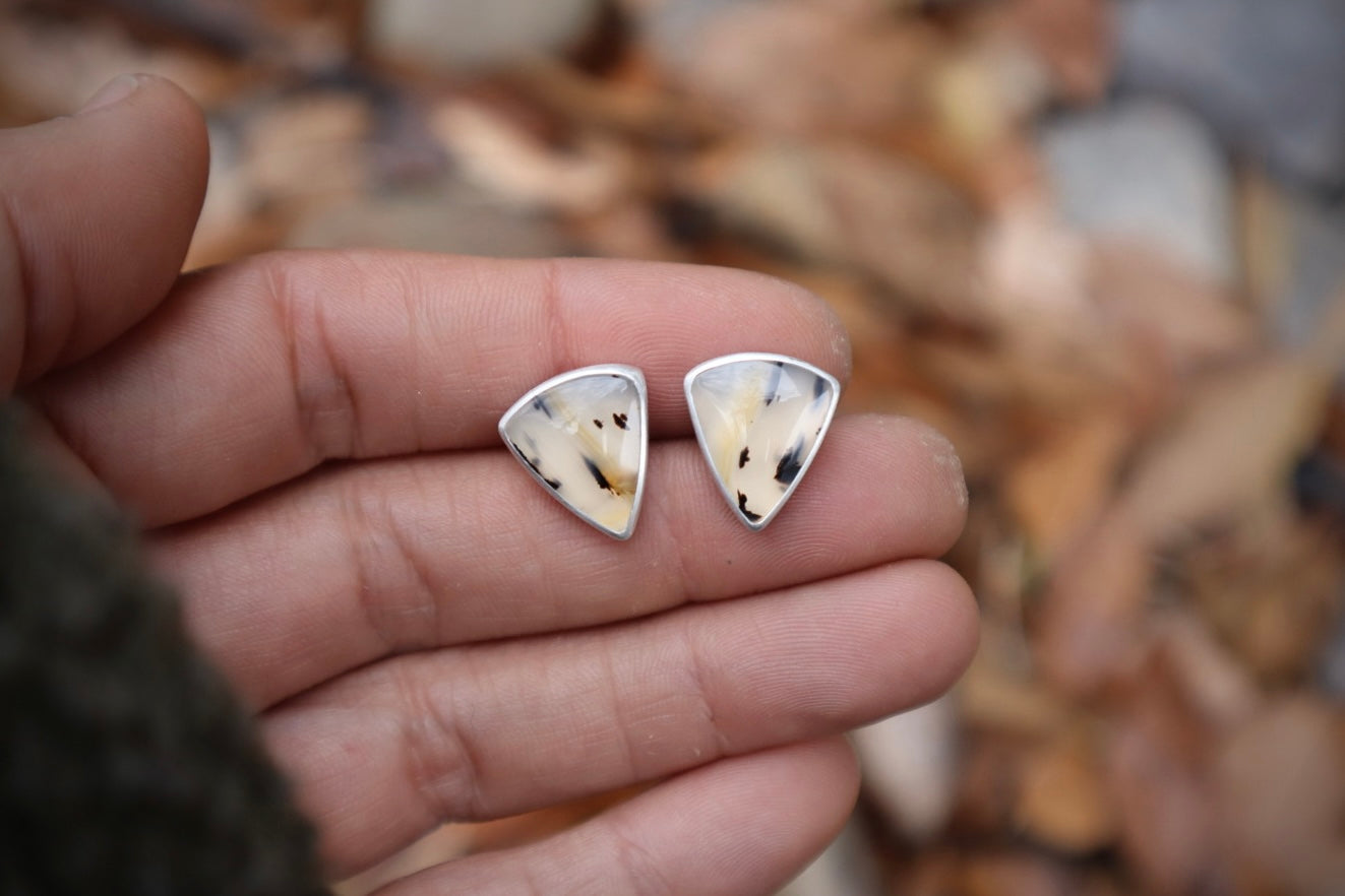 Montana Agate is such a magical material because it can have so many different looks to it. This pair has a softer energy with some yellow and black speckles. They are the perfect size for a statement pair of studs that will go with just about any outfit. Comfortable and lightweight.