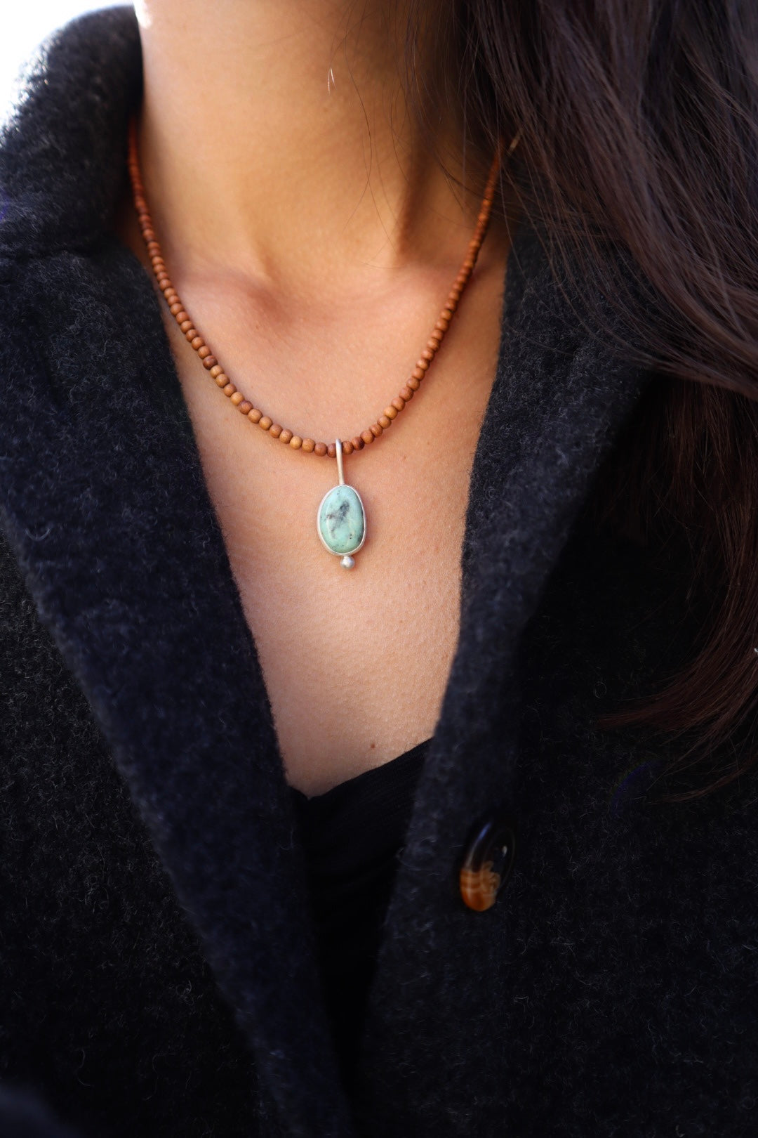 Materials: Recycled sterling silver, sandalwood beads, 14k goldfill clasp components